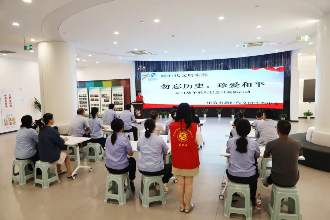 当天,乐清市新时代文明实践中心还组织开展了“勿忘历史 珍爱和平”——抗日战争胜利纪念日观影活动。众多市民齐聚一堂,共同观看爱国主义电影《八佰》。在观影室里,所有人屏气凝神地盯着大屏幕,银幕上战火纷飞的惨烈场景时刻揪着每个人的内心。影片结束后,大家的心情久久不能平静,心中既怀着对英雄烈士的崇高敬意,同时也深刻感受到了和平的来之不易。